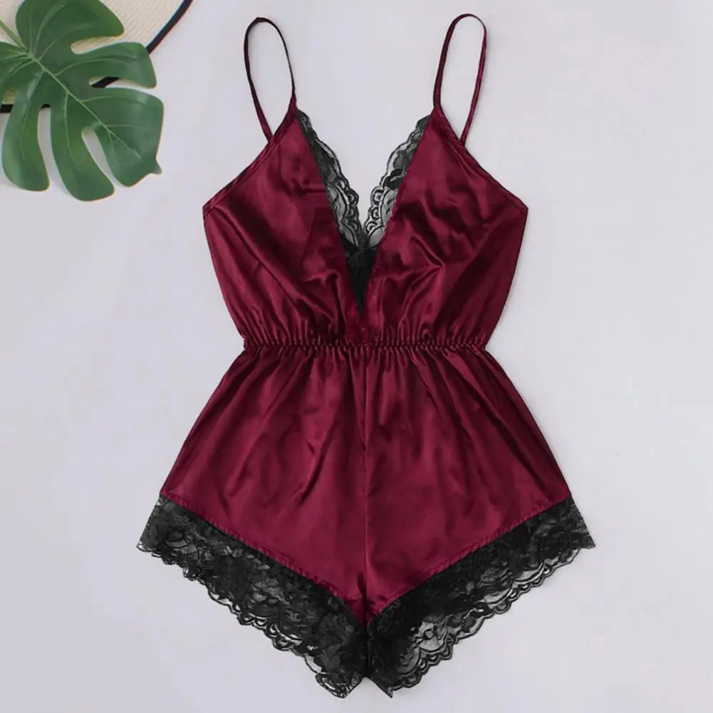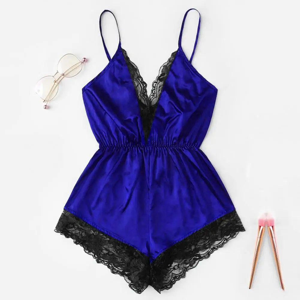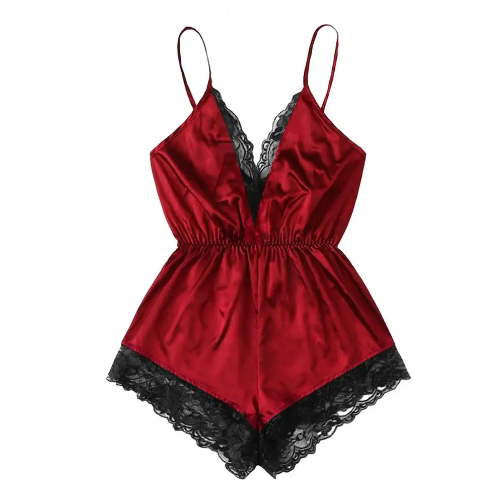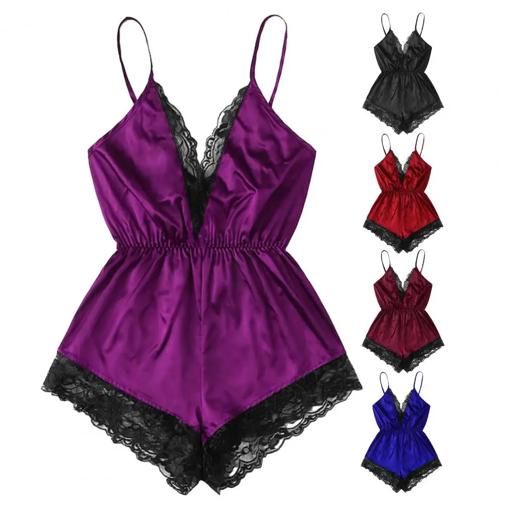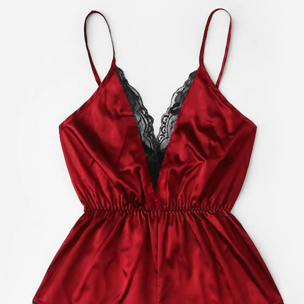 ملابس نوم نسائية مثيرة بياقة على شكل حرف V بدون أكمام وبدلة نوم من الساتان الصناعي وخياطة من الدانتيل ملابس نوم واسعة الساق بدون ظهر