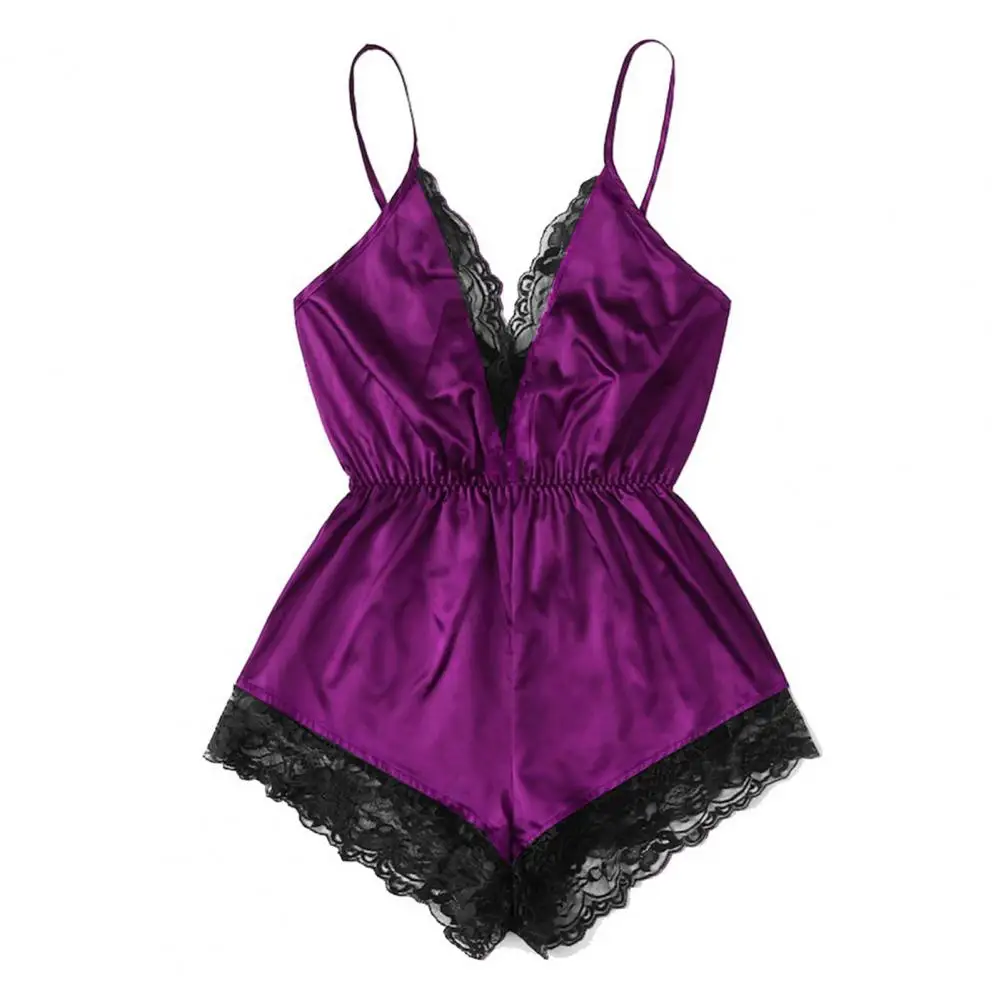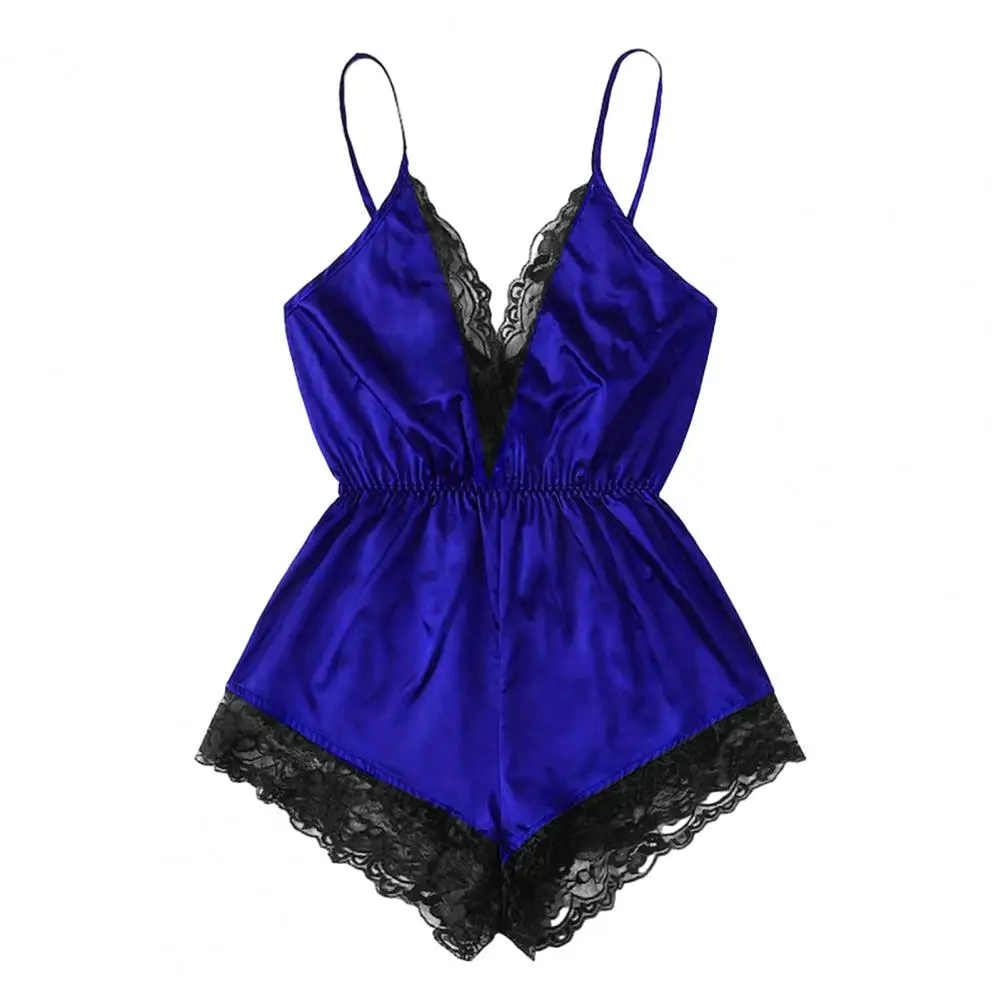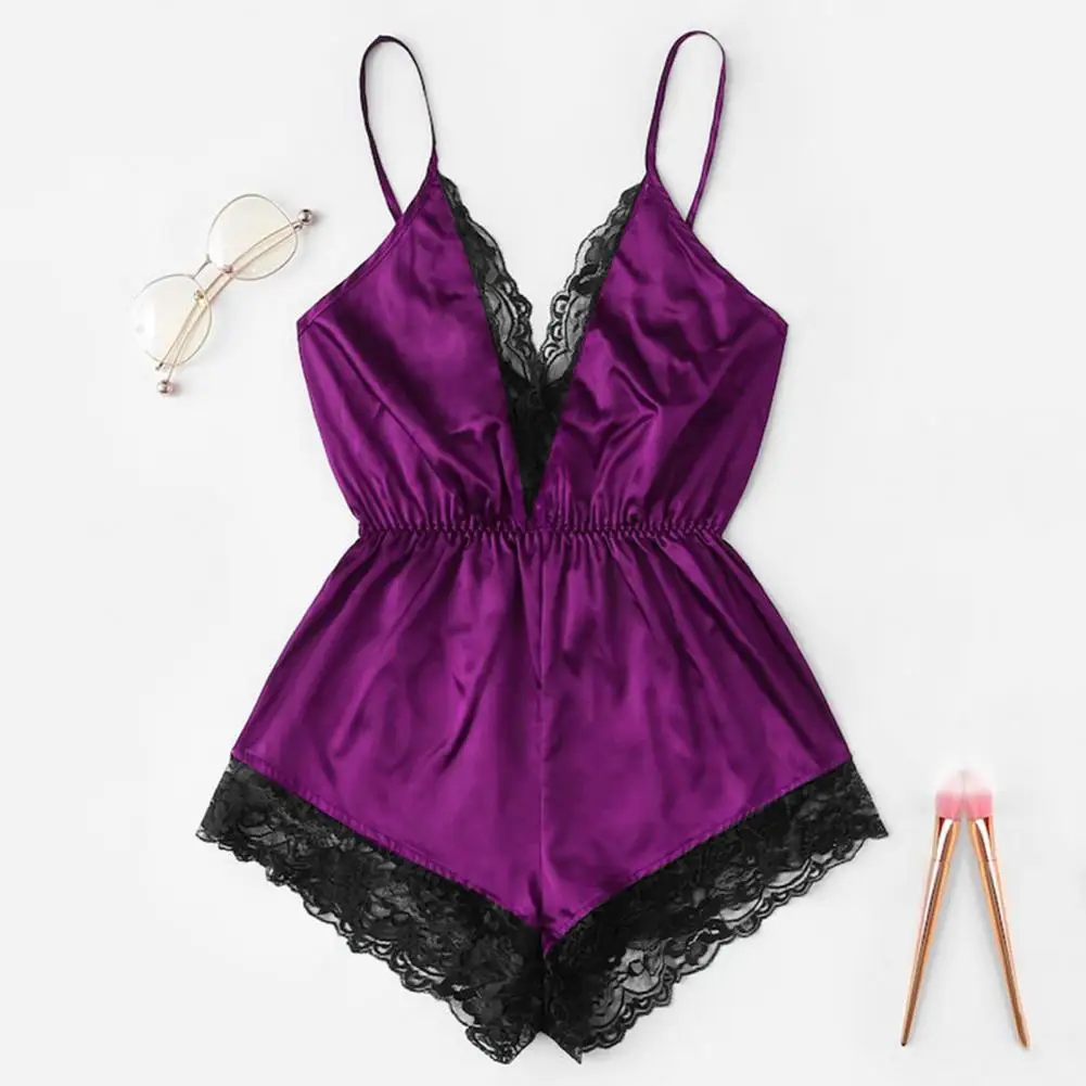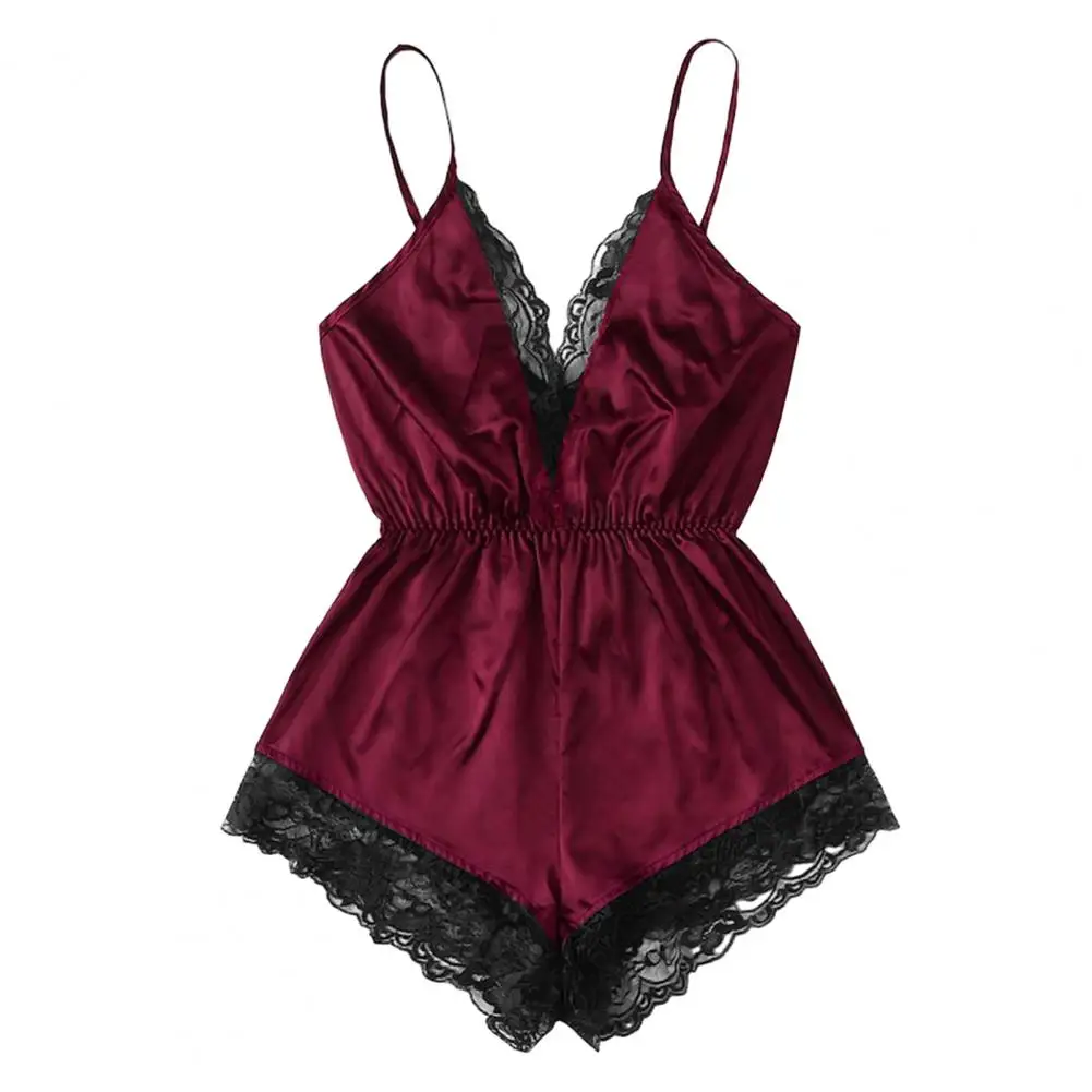 ملابس نوم نسائية مثيرة بياقة على شكل حرف V بدون أكمام وبدلة نوم من الساتان الصناعي وخياطة من الدانتيل ملابس نوم واسعة الساق بدون ظهر