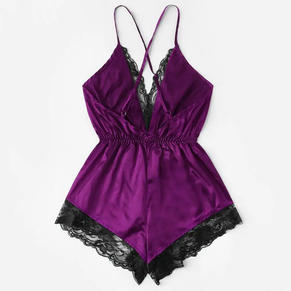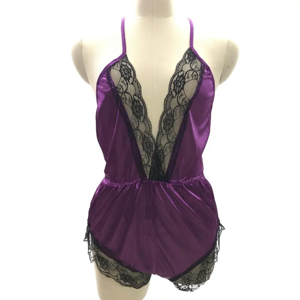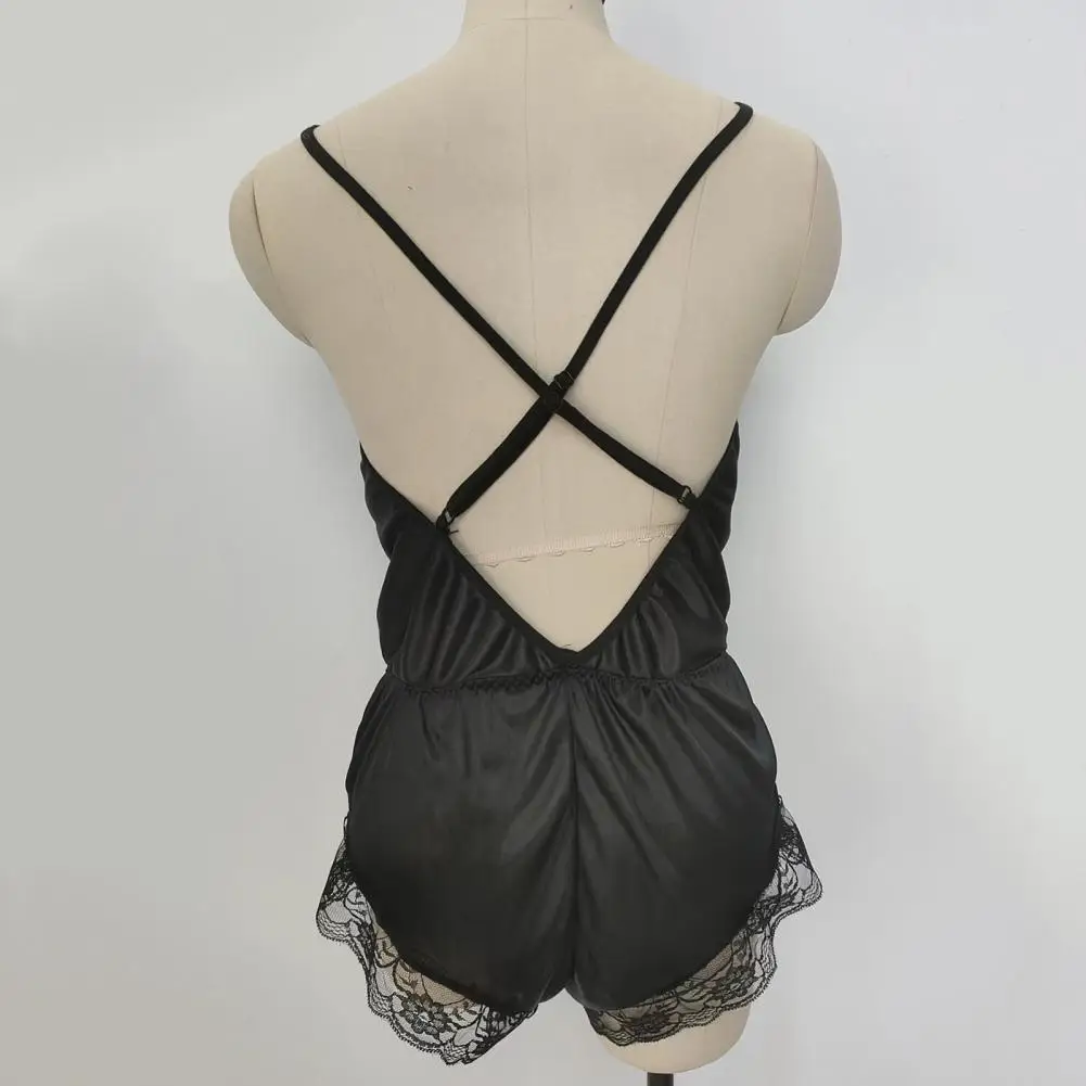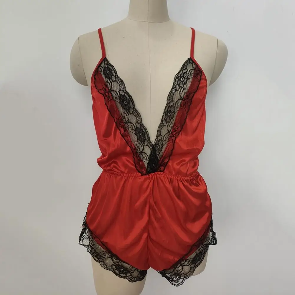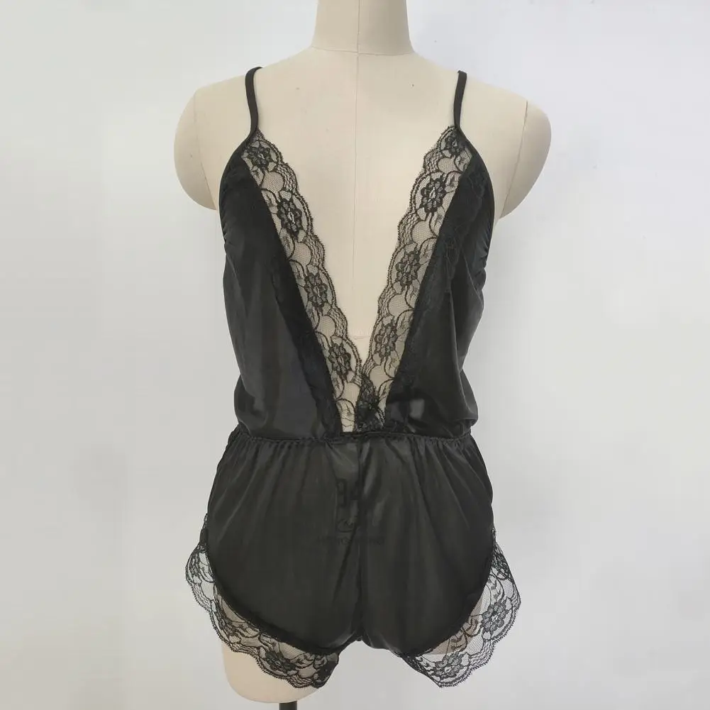 ملابس نوم نسائية مثيرة بياقة على شكل حرف V بدون أكمام وبدلة نوم من الساتان الصناعي وخياطة من الدانتيل ملابس نوم واسعة الساق بدون ظهر