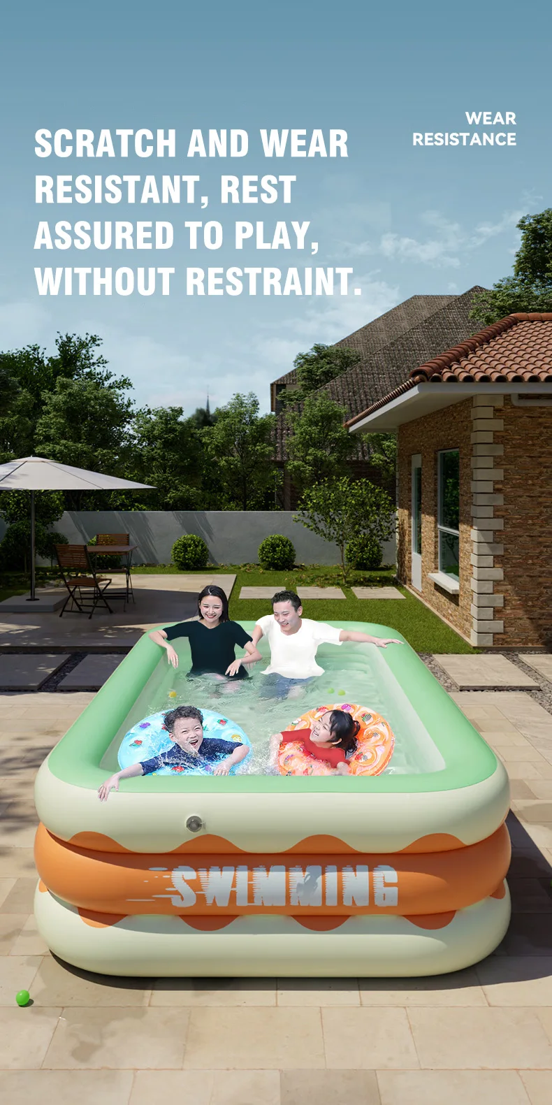 1. حمام السباحة مصنوع من مادة PVC ، وهو عالي القوة ودائم وطويل الاستخدام.