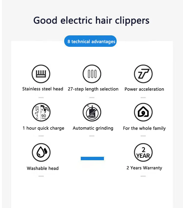 • تمديد وقت الاستخدام :مع نوع محرك فعال وبطارية تدوم طويلاً ، توفر ماكينة قص الشعر هذه وقت استخدام ممتد لمدة 85 دقيقة ، مما يضمن قص الشعر دون انقطاع.