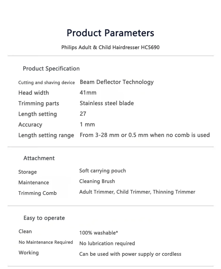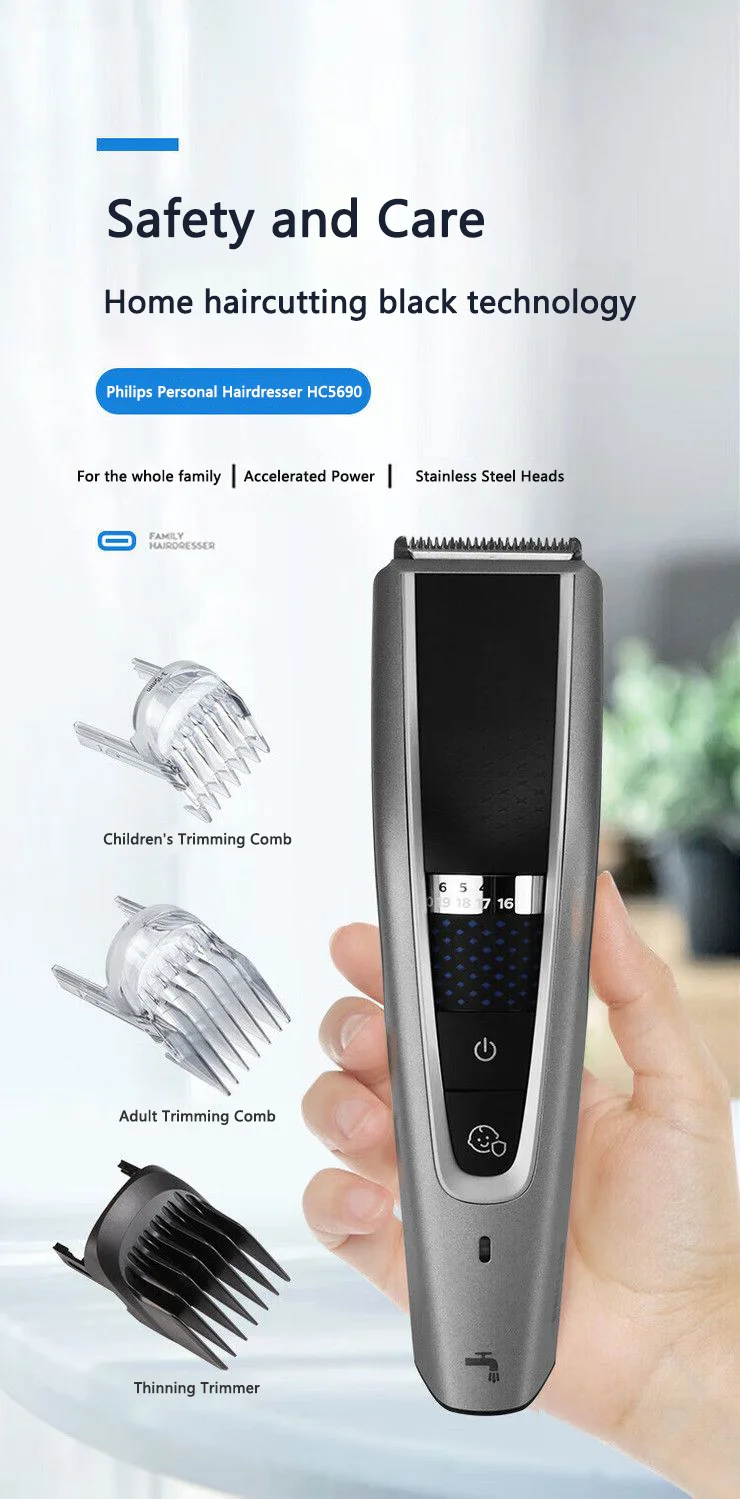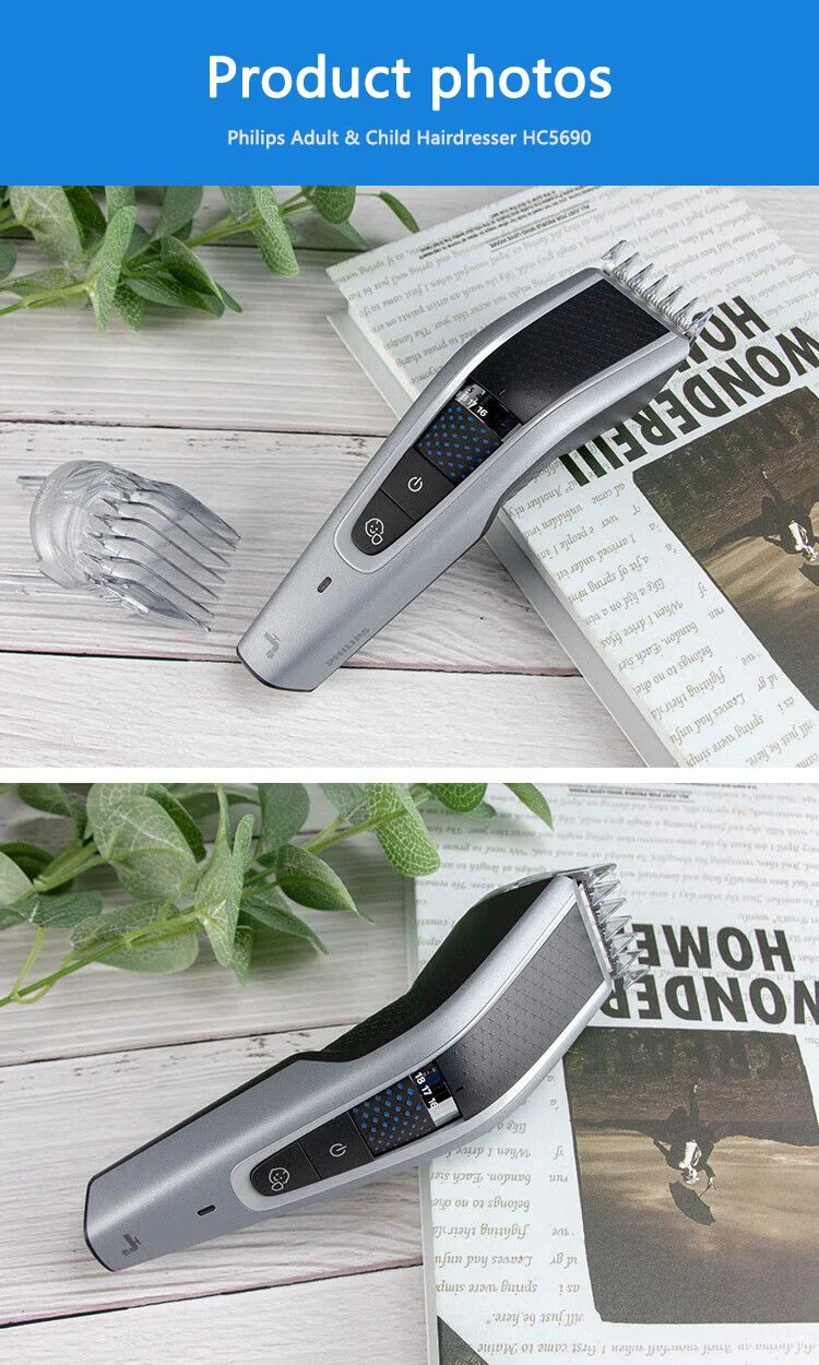 • مادة نصل عالية الجودة :يتميز فيليبس HC5690 بشفرة من الفولاذ المقاوم للصدأ ، مما يضمن المتانة والحدة طويلة الأمد لقطع دقيق.