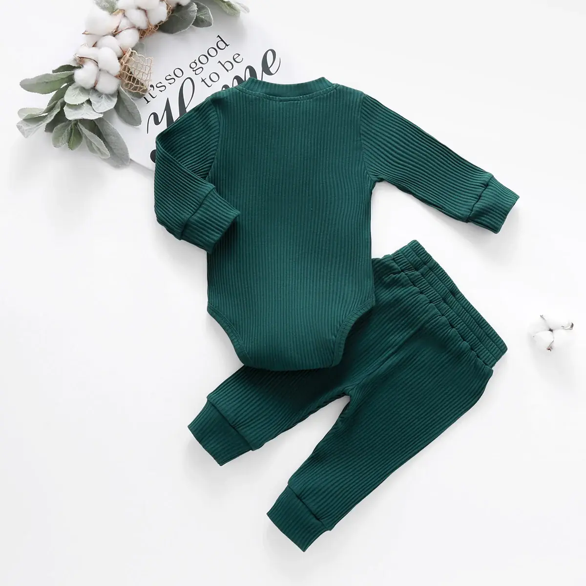 بدلات ملابس متماسكة للأطفال الرضع، أزرار برقبة دائرية وأكمام طويلة + بنطلون طويل مرن